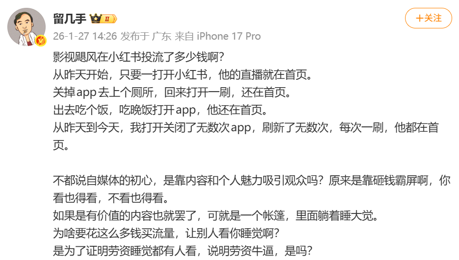 DoNews1月27日消息,今日网红留几手发微博称,影视飓风在小红书砸钱投流霸屏。留几手表示,从昨天开始,影视飓风创始人Tim的雪地生存100小时直播持续占据小红书首页推荐位,自己多次关闭、刷新小红书app,该直播仍始终出现在首页,他直言Tim此次的直播内容并无价值,仅是播放在帐篷内睡大觉。