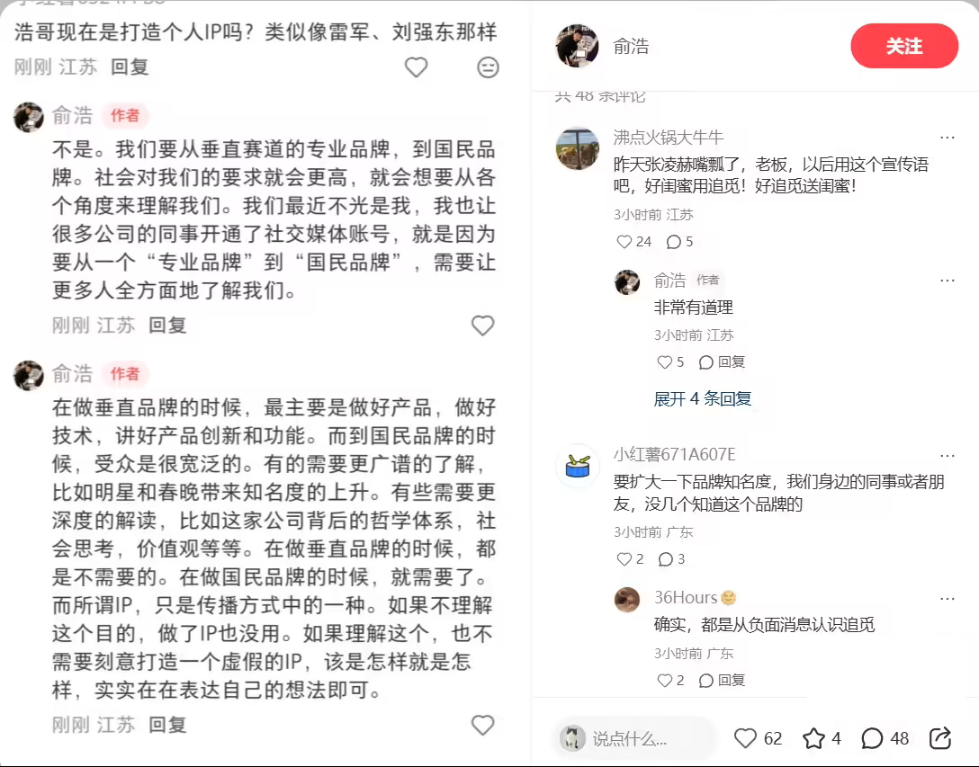同时他在小红书发文,否认学雷军、刘强东做个人 IP。有网友询问俞浩“现在是打造个人 IP 吗?类似像雷军、刘强东那样”,俞浩表示:不是。我们要从垂直赛道的专业品牌,到国民品牌。