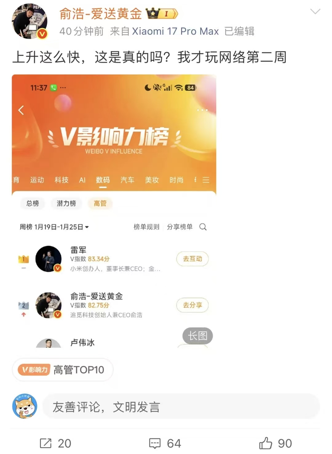 DoNews1月28日消息,今日追觅CEO俞浩在微博晒一截图,显示自己V影响周榜已经排到第二,仅次于雷军。俞浩配文称:“上升这么快,这是真的吗?我才玩网络第二周。”