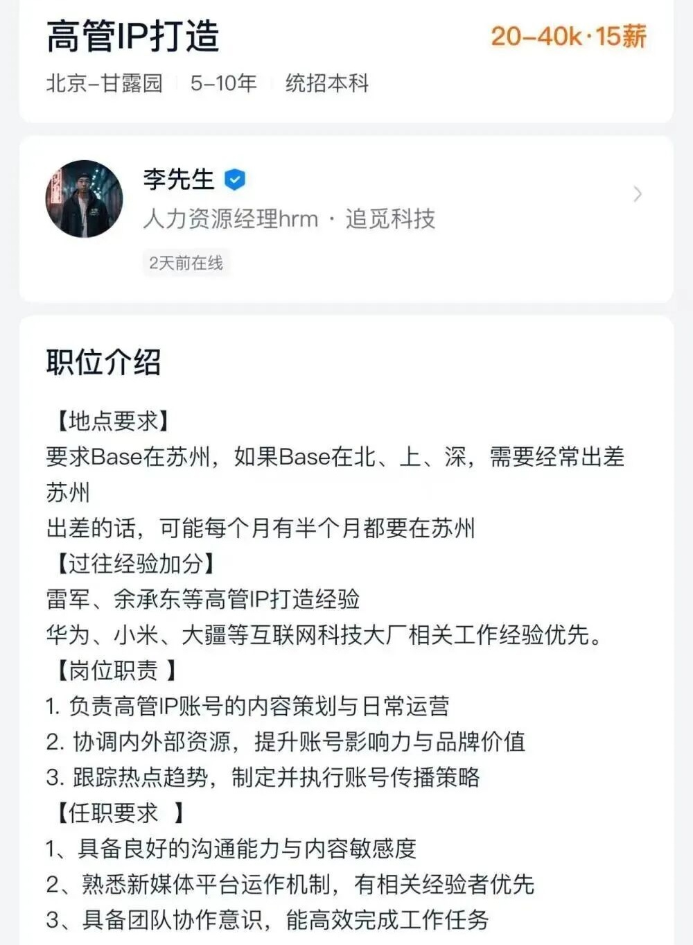 不过有网友发现,招聘软件显示,追觅科技新增“高管IP打造”岗位招聘信息,所属部门为集团公关部,薪资范围设定在20-40k。岗位介绍显示,明确将有雷军、余承东等知名企业家高管IP打造经验列为加分项,同时优先考虑有华为、小米、大疆等互联网科技大厂相关工作经验的求职者。