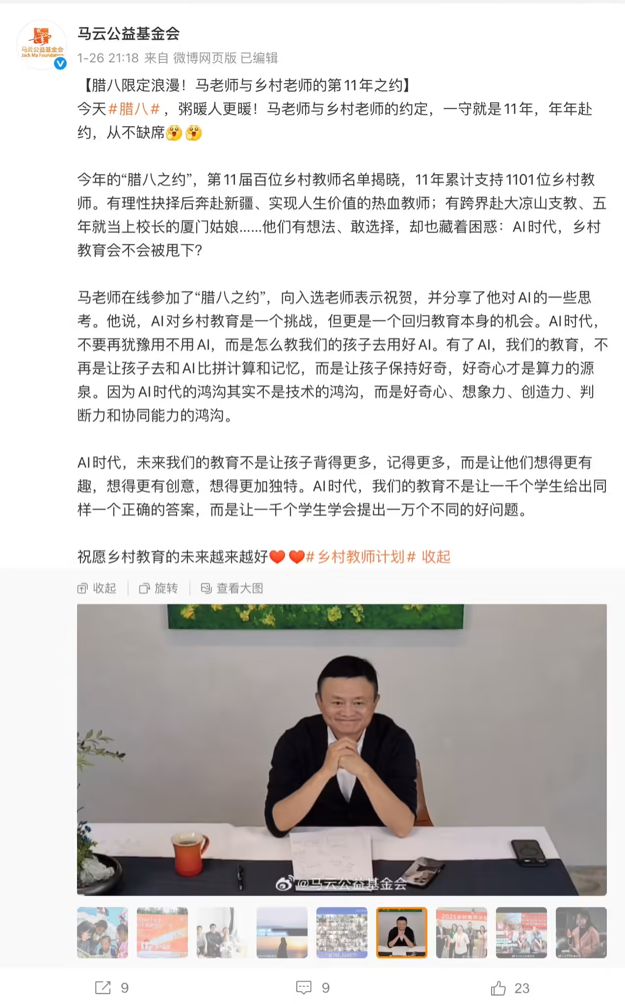 马云说,AI 对乡村教育是一个挑战,但更是一个回归教育本身的机会。AI 时代,不要再犹豫用不用 AI,而是怎么教我们的孩子去用好 AI。有了 AI,我们的教育,不再是让孩子去和 AI 比拼计算和记忆,而是让孩子保持好奇,好奇心才是算力的源泉。因为 AI 时代的鸿沟其实不是技术的鸿沟,而是好奇心、想象力、创造力、判断力和协同能力的鸿沟。