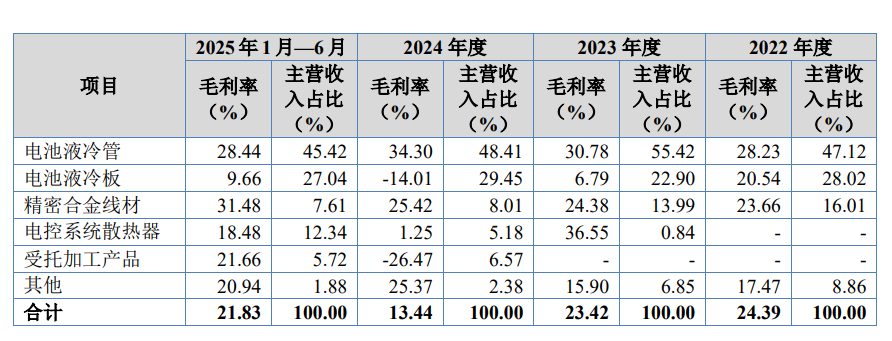 电池液冷板:报告期内,电池液冷板毛利率分别为20.54%、6.79%、-14.01%、9.66%。