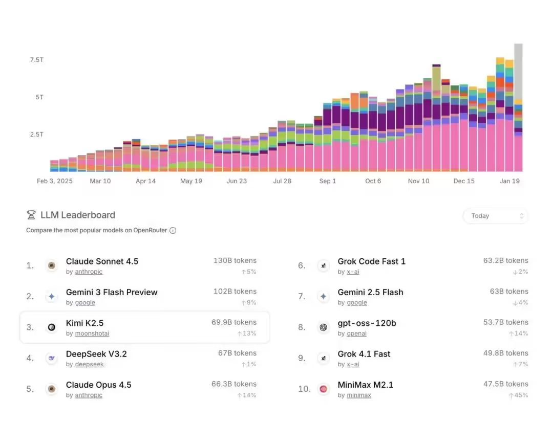 在 Openrouter 上,K2.5 的排名已经来到第三位,仅次于 Claude Sonnet 4.5 和 Gemini 3 Flash。