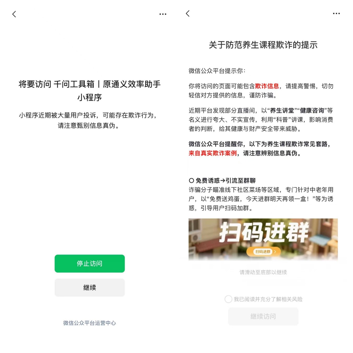 如果用户选择继续访问,则会弹出“防范养生课程欺诈提示”。据悉,目前用户无法分享该小程序至微信群和好友,但能够分享至朋友圈。小程序内部功能仍可正常使用。