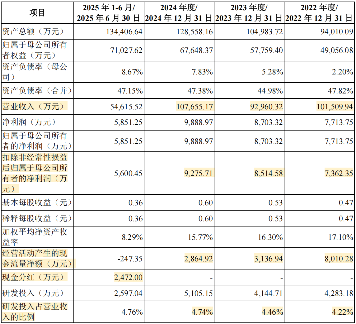 2022-2024年,公司营业收入分别为10.15亿、9.30亿、10.77亿,扣非后归母净利润分别为0.74亿、0.85亿、0.93亿。2022-2024年的营业收入年均复合增长率为2.98%。2025年度,公司预计实现营业收入11.54亿元,同比增长7%,扣非后归母净利润1.12亿元,同比增长21%。