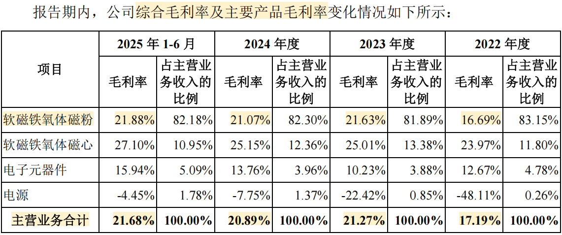 2022-2024年,公司的软磁铁氧体磁粉产能分别为8.25 万吨、9.24 万吨和10.71 万吨,2025 年1-6 月年化后的产能约为10.93万吨。在本次IPO募投项目中,公司拟大幅新增磁粉产能7.5万吨。