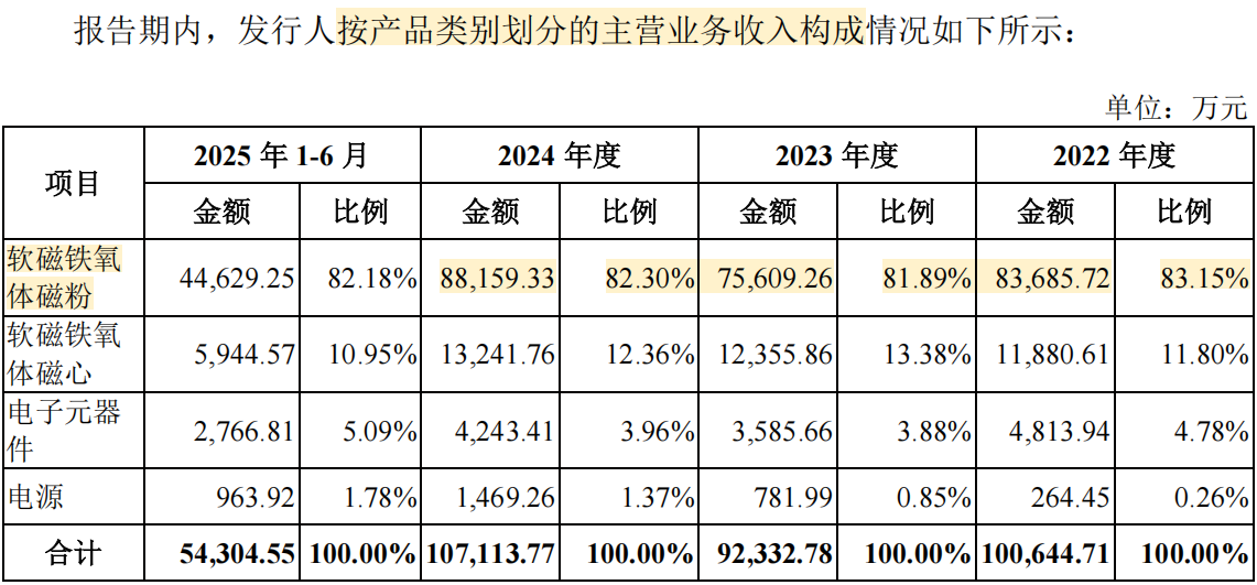 公司聚焦于软磁材料中的铁氧体技术路线,产品以磁粉和磁心为主,应用于新能源汽车、光伏储能、通信设备、电源系统等多个场景。其中,软磁铁氧体磁粉为公司主要收入来源,收入占比超过80%。