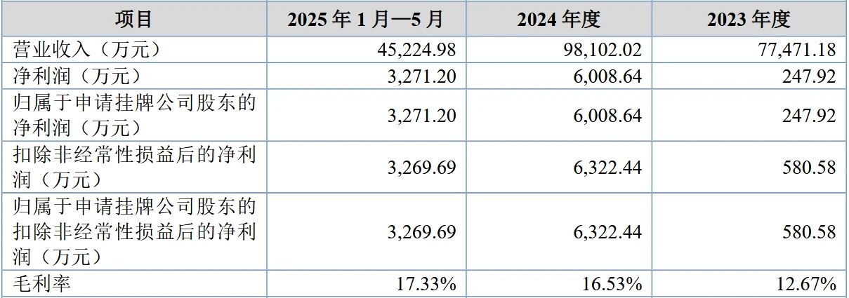 公司解释主要系营业收入的上涨以及毛利率的提升带动了利润水平的上升。2025年1-5月,公司实现营业收入4.52亿元,扣非后归母净利润0.33亿元。
