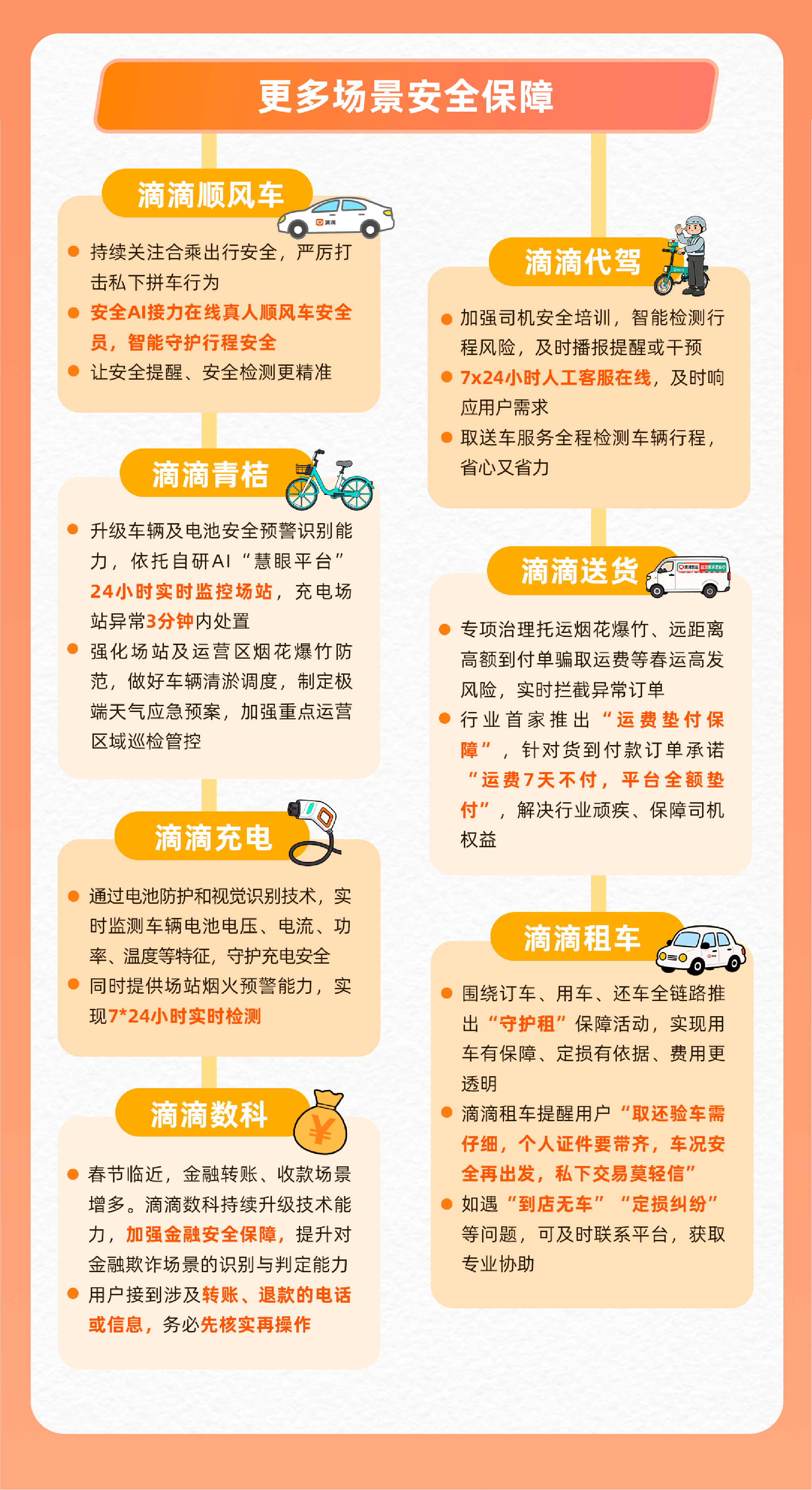 针对春运车流人流密集、扶老携幼、长距离跨城、醉酒和夜间出行增多等风险特点,在夯实安全体系的基础上,滴滴也围绕重点场景加强守护。