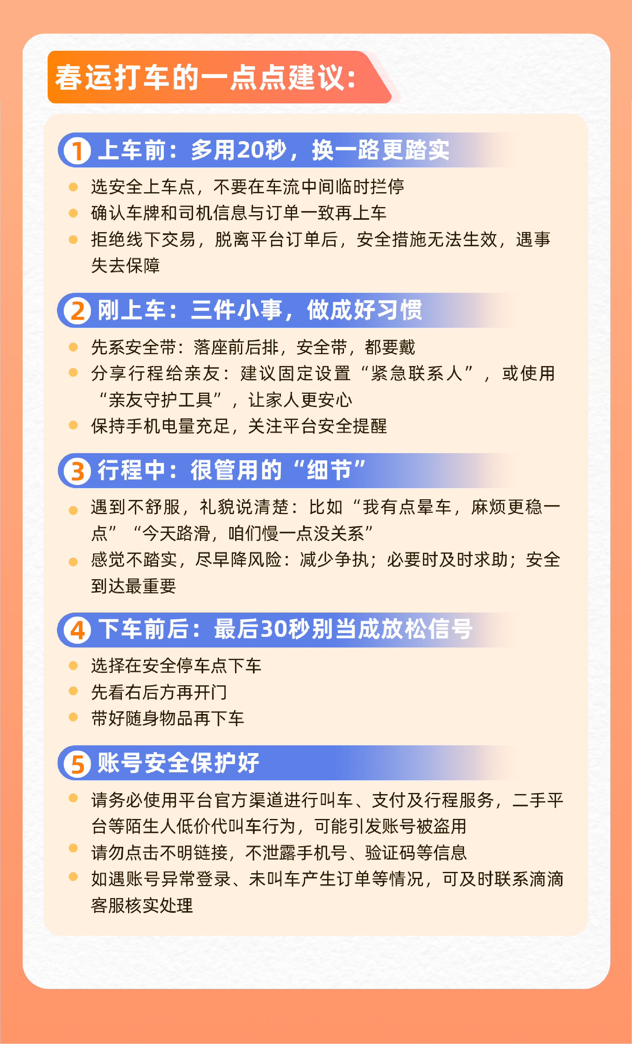 春运路上,多一分确认、少一点侥幸,就能减少很多不必要的风险。滴滴会持续做好春运安全与服务保障,祝愿大家每一次出发都顺顺当当,每一次抵达都平平安安!