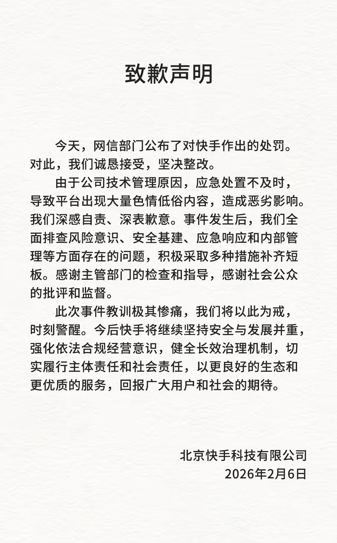 由于公司技术管理原因,应急处置不及时,导致平台出现大量色情低俗内容,造成恶劣影响。我们深感自责、深表歉意。事件发生后,我们全面排查风险意识、安全基建、应急响应和内部管理等方面存在的问题,积极采取多种措施补齐短板。感谢主管部门的检查和指导,感谢社会公众的批评和监督。