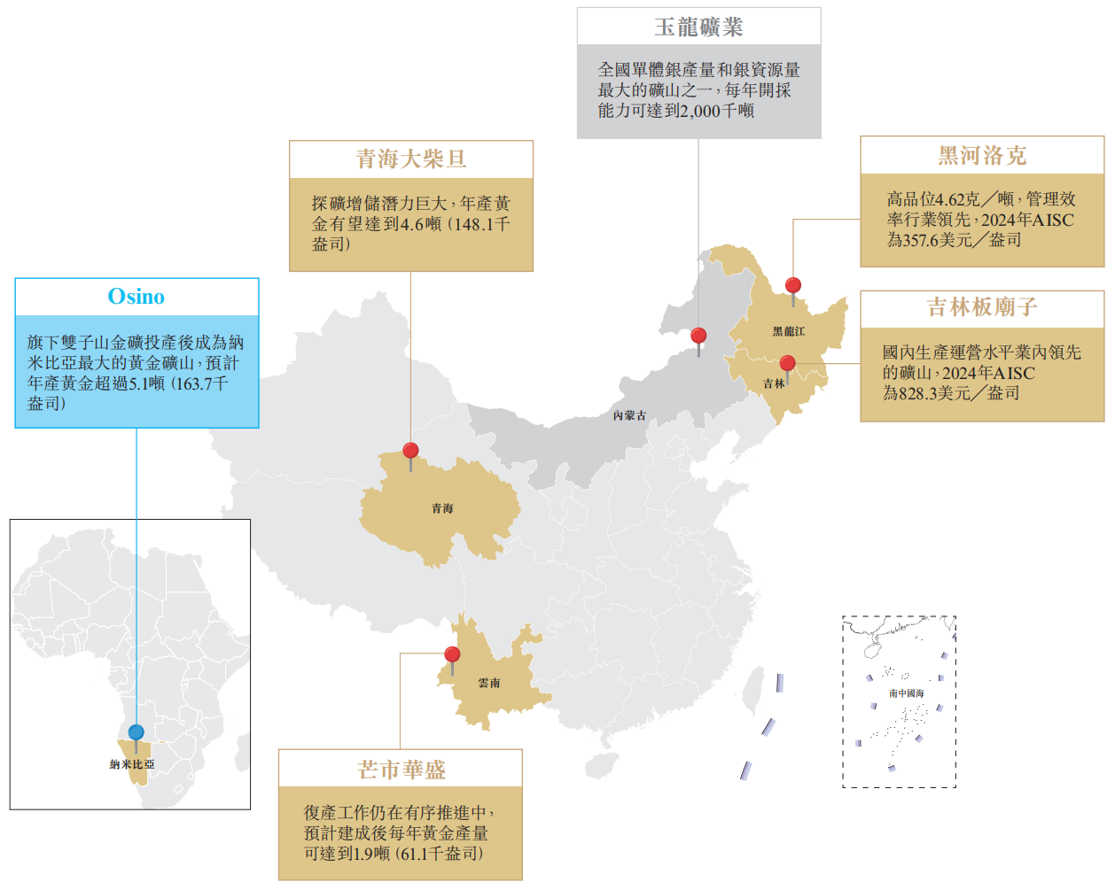 公司拥有并经营6家矿业企业,分布于中国(黑龙江、吉林白山、青海海西州、内蒙古西乌珠穆沁旗及云南)纳米比亚。其中,5家金矿企业拥有6个采矿许可证、29个探矿许可证及4个待申请探矿许可证;一家多金属矿企业持有3个采矿许可证和6个探矿许可证。