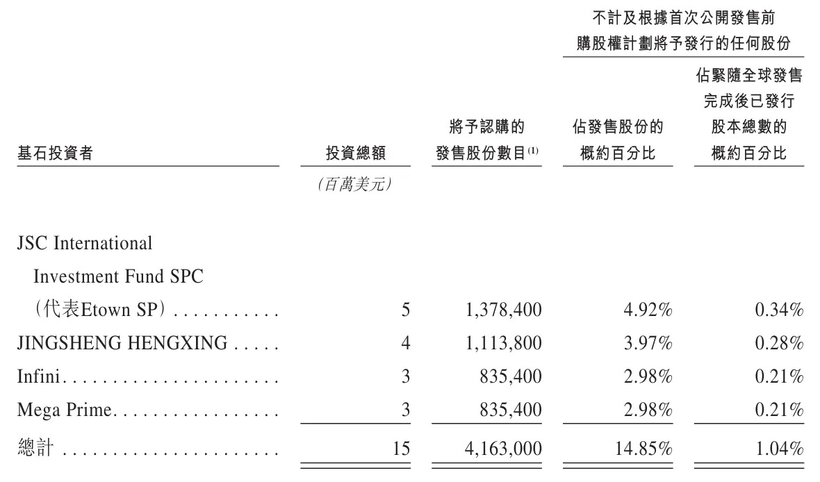 海致科技基石投资者分别为北京金融控股集团有限公司旗下JSC International、智谱旗下JINGSHENG HENGXING、无极资本Infini、大湾区共同家园投资有限公司旗下Mega Prime,共认购1500万美元。