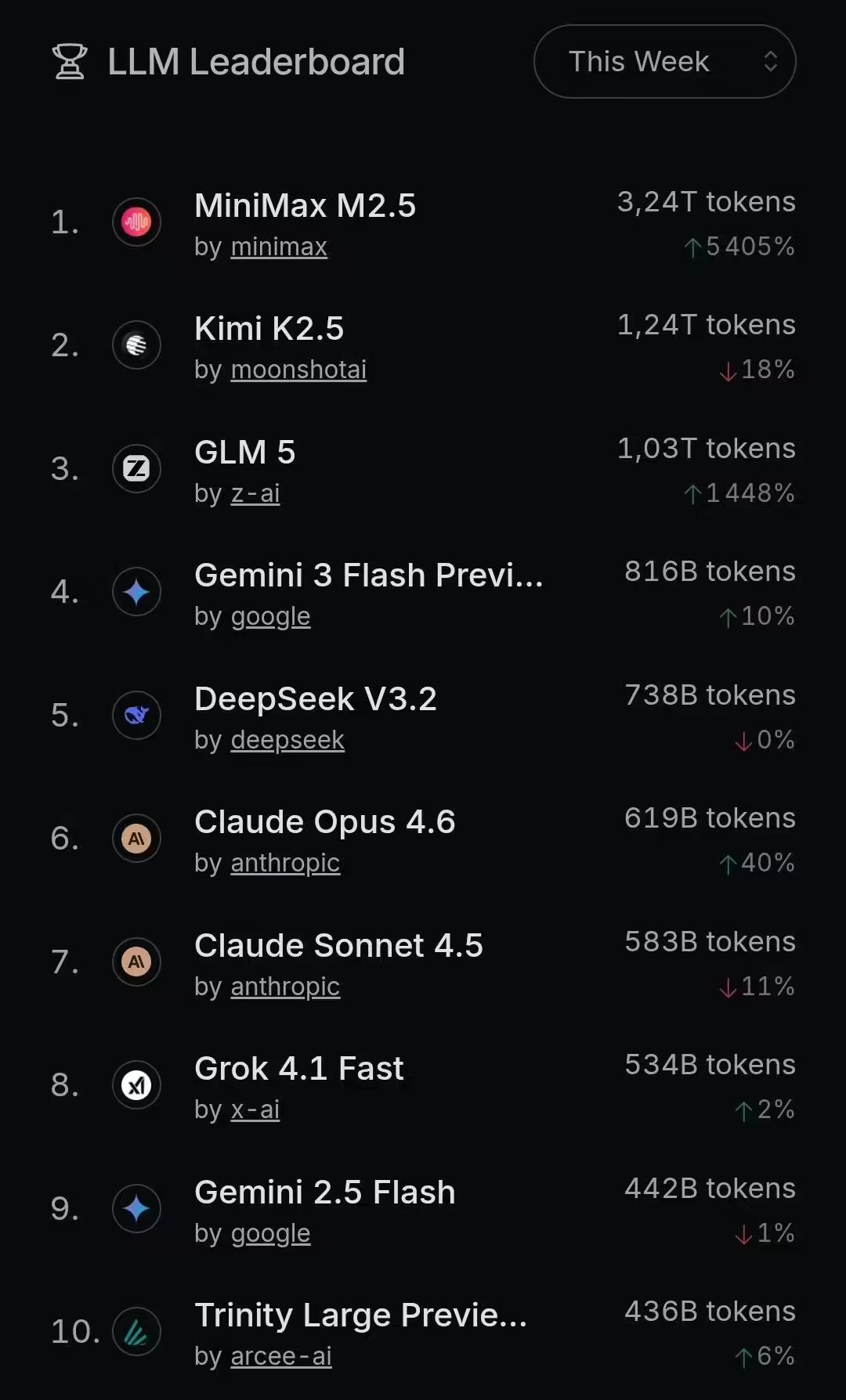 紧随其后的是月之暗面上月发布的 Kimi K2.5 模型,以 4.02 万亿的 Token 使用量位居第二。榜单前五名中的其余席位由谷歌的 Gemini 3 Flash Preview、深度求索(DeepSeek)的 V3.2 以及 Anthropic 的 Claude Sonnet 4.5 占据。