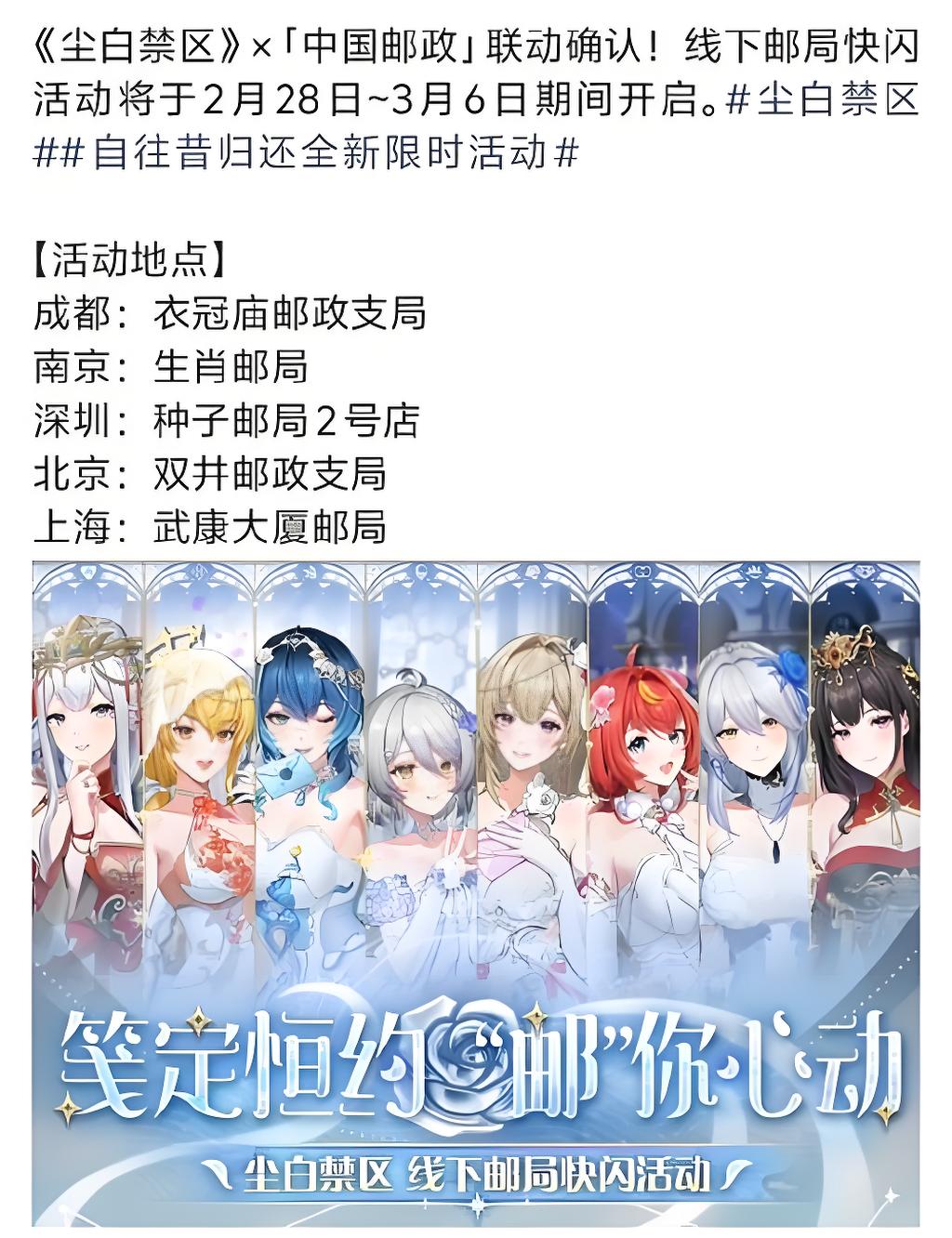 此前,《尘白禁区》发布微博称,将联动中国邮政推出线下邮局快闪活动“笺定恒约”,并同步发售联名纪念礼盒。