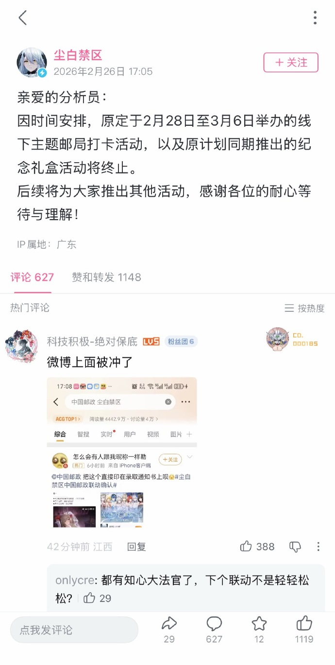 DoNews2月27日消息,2月26日,#中国邮政 尘白禁区#登上热搜,此前,因手游《尘白禁区》官宣联动中国邮政推出线下邮局快闪活动引发争议。