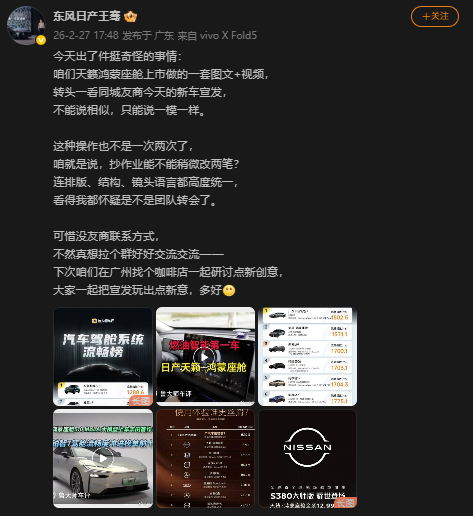 DoNews2月28日消息,东风日产汽车销售有限公司新能源品牌总经理王骞 27 日晚在微博发声,直指同城汽车品牌新车宣发内容与天籁鸿蒙座舱上市的图文、视频宣发物料高度雷同,“不能说相似,只能说一模一样”。