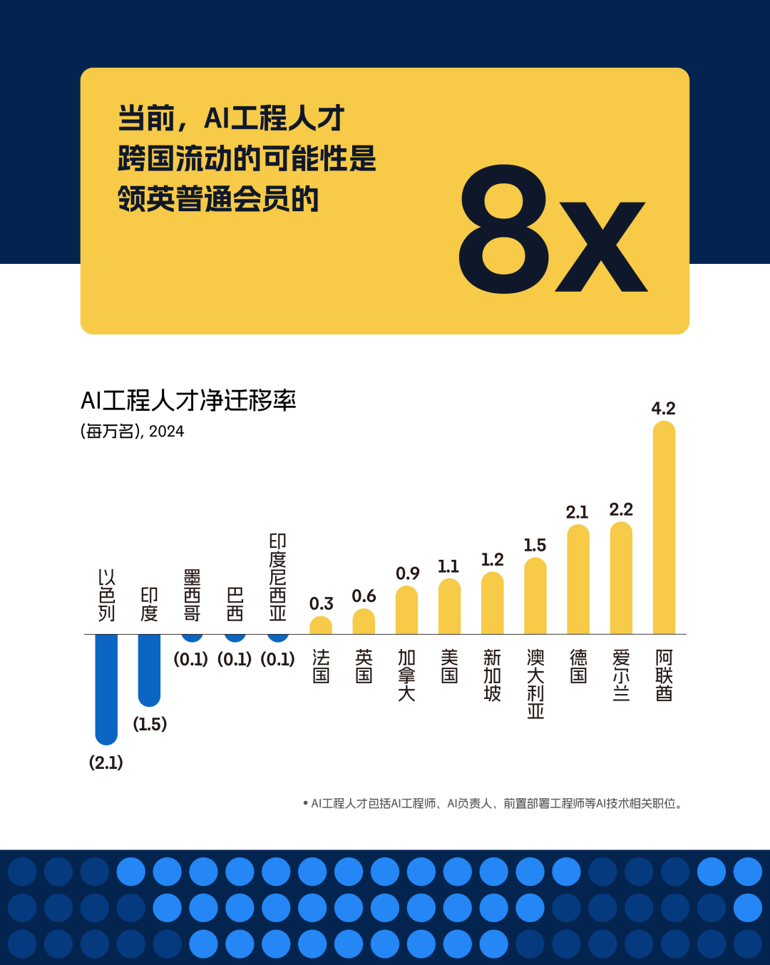 数据显示,AI工程人才跨国流动的倾向达到领英会员平均水平的8倍,成为全球流动最活跃的群体。从流向来看,阿联酋、部分欧洲枢纽及美国是吸引这类人才的主要地区,而印度、以色列等则持续向外输送相关人才。这表明,一场围绕高技能人才的全球竞争,已进入全新阶段。