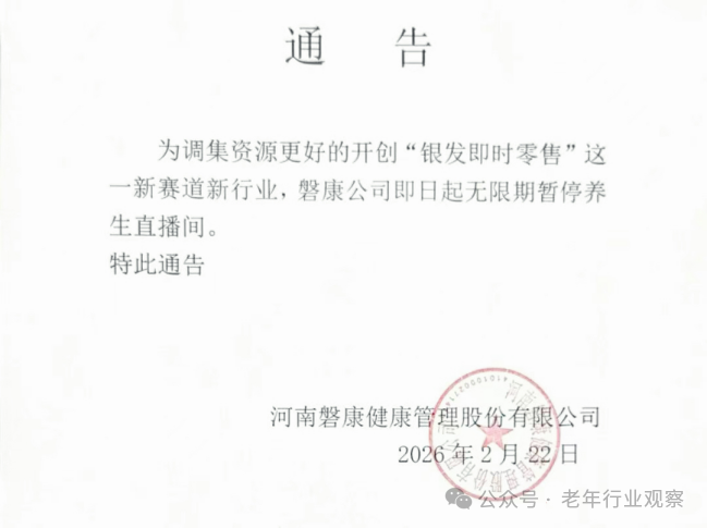 DoNews3月3日消息,据老年行业观察报道,近日,私域直播头部品牌——河南磐康健康管理股份有限公司(以下简称“磐康年华”)发布了一则内部公告,宣布为调集资源更好的开创“银发即时零售”这一新赛道新行业,即日起无限期暂停养生直播间。