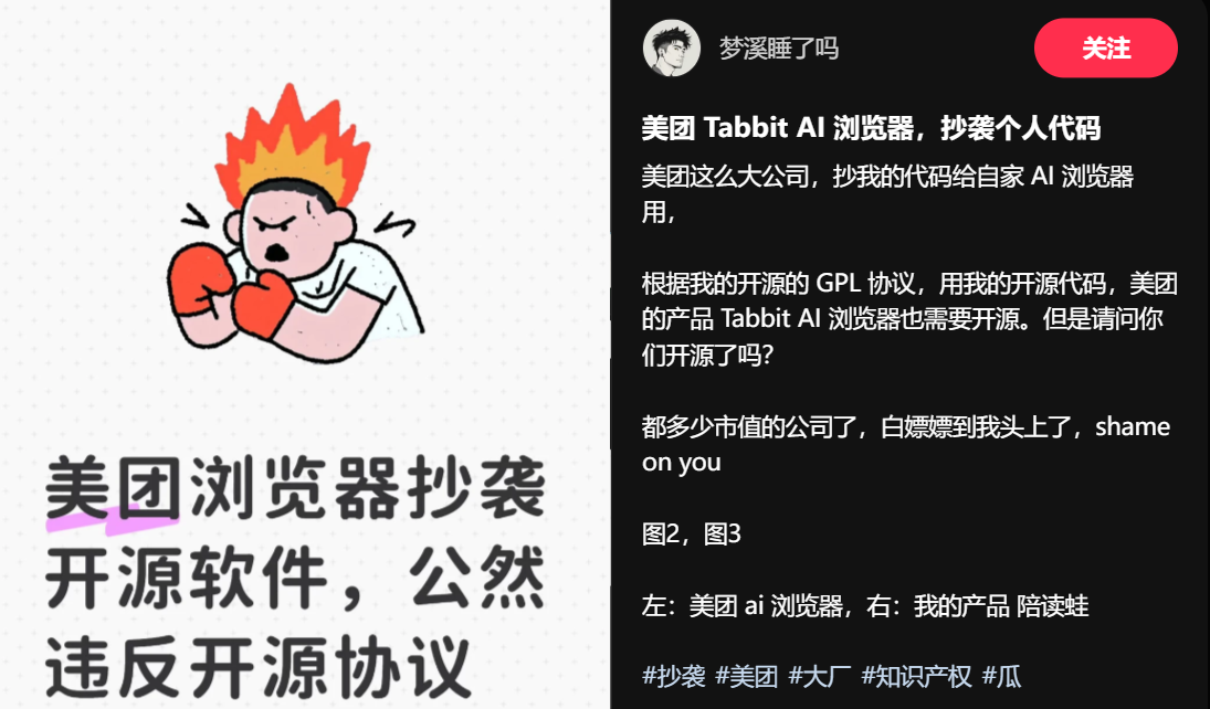 网友表示,根据GPL协议,使用他的代码的产品都需要开源,而美团并未开源Tabbit。
