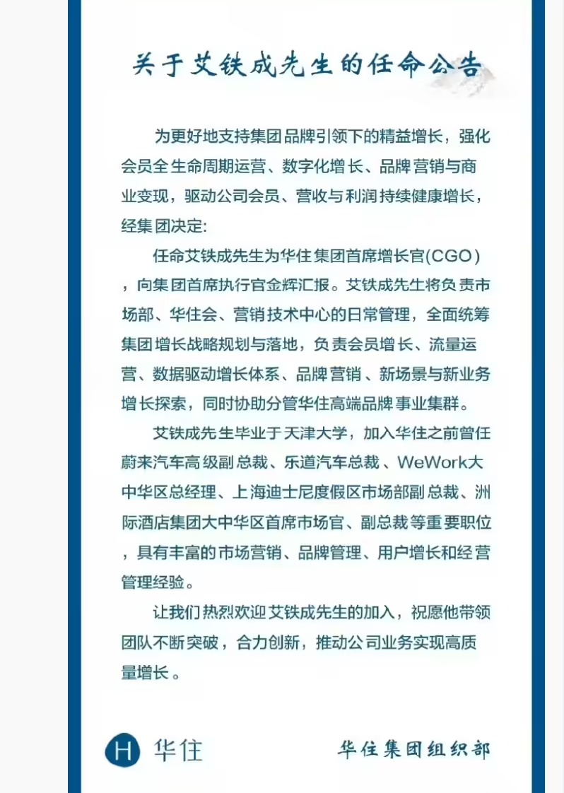 任命公告称,艾铁成将负责市场部、华住会、营销技术中心的日常管理,全面统筹集团增长战略规划与落地,负责会员增长、流量运营、数据驱动增长体系、品牌营销、新场景与新业务增长探索,同时协助分管华住高端品牌事业集群。