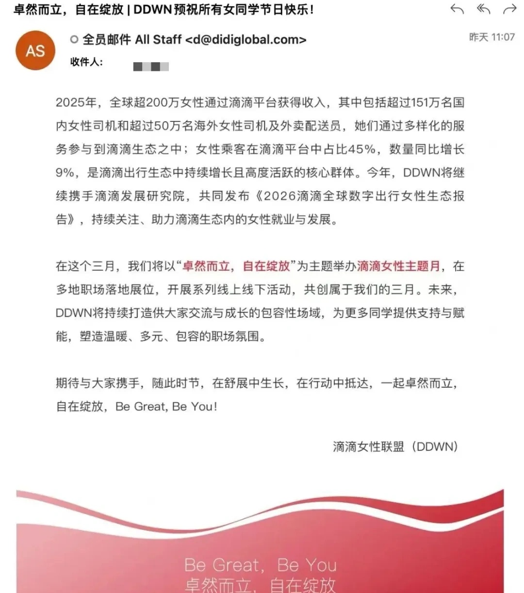 DoNews3月4日消息,今年三八妇女节恰逢周日,为弥补女性员工无法享受专属假期遗憾,滴滴近期发布内部邮件,正式宣布所有女性员工将在3月6日享受半天福利假。同时,滴滴集团妇女联合会和DDWN(滴滴女性联盟DiDi Women's Network)为每位女员工准备一份礼盒,包含麦卢卡蜂蜜、平阴重瓣玫瑰花茶等。