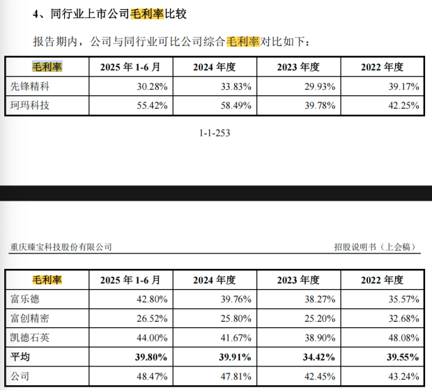 2022年至2025年上半年,臻宝科技综合毛利率分别为 43.24%、42.45%、47.81%和 48.47%。其中半导体行业产品毛利率分别为 50.80%、54.07%、56.57%和 54.24%,显著高于同行平均,显示面板行业产品毛利率分别为 32.88%、22.92%、25.04%和 25.57%。