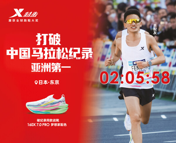 同日,东京马拉松赛场传来重磅喜讯:特步跑步代言人丰配友脚踏特步冠军版跑鞋160X 7.0 PRO梦想家配色,以2小时05分58秒的成绩刷新中国男子马拉松纪录,斩获本场亚洲籍运动员第一。