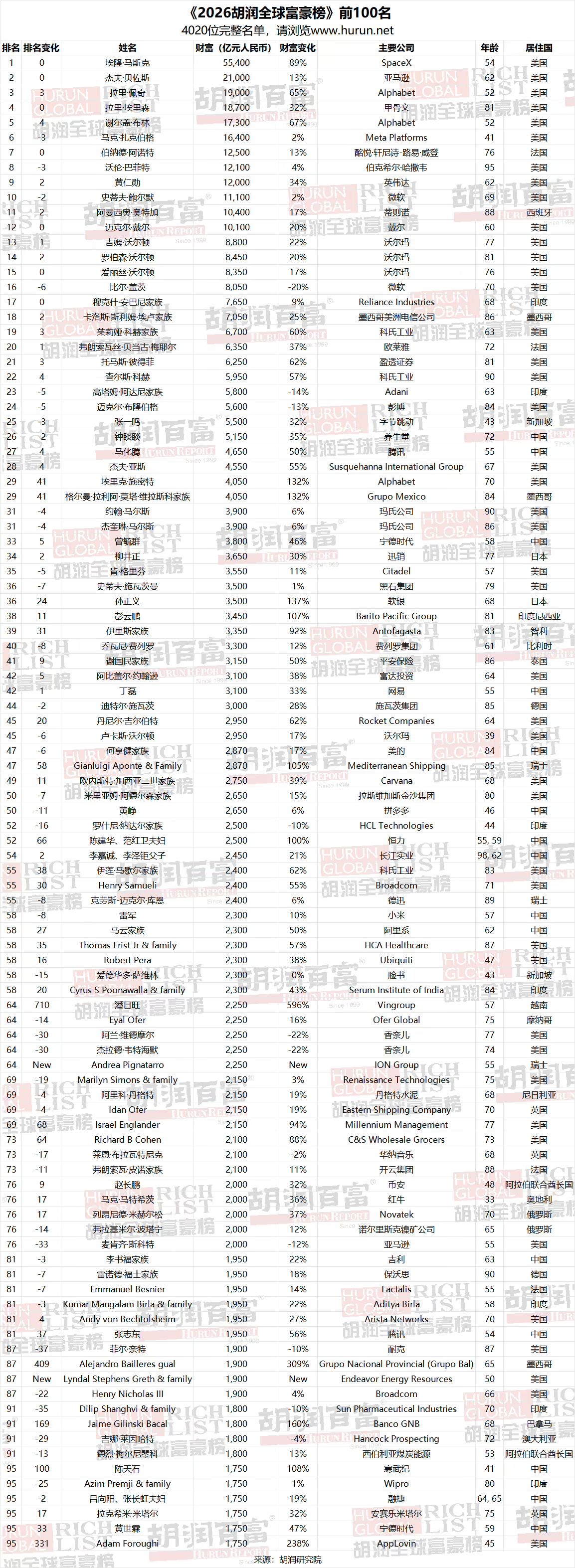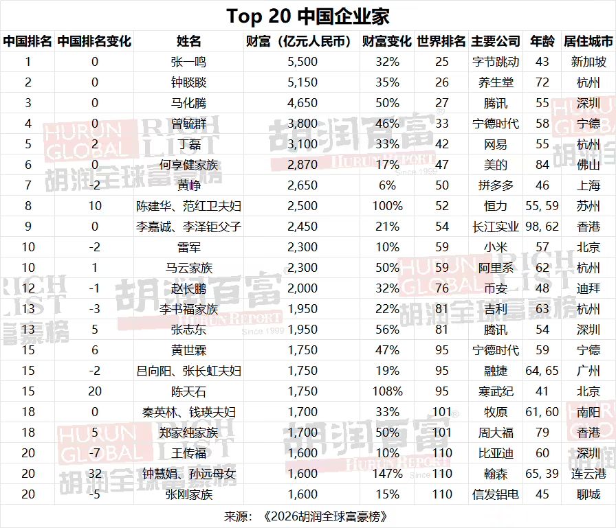 DoNews3月6日消息,胡润研究院 5 日发布《2026 胡润全球富豪榜》(Hurun Global Rich List 2026)。财富计算的截止日期为 2026 年 1 月 15 日。这是胡润研究院连续第 15 年发布“全球富豪榜”。