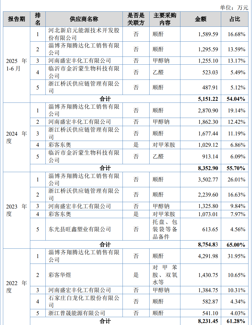 报告期内,公司主要原材料之一对甲苯胺全部自关联方彩客东奥进行采购。