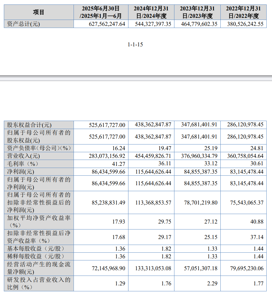 报告期内(2022年至2025年上半年),彩客科技的营业收入分别为3.61亿元、3.77亿元、4.54亿元、2.83亿元;净利润分别为8314.55万元、8485.54万元、1.16亿元、8643.46万元。