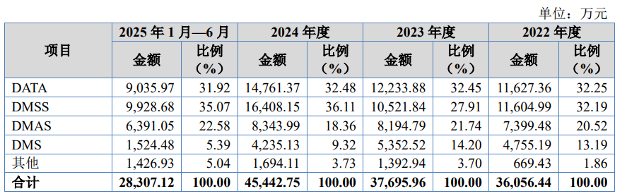 公司主营业务收入主要来自DATA、DMSS、DMAS和DMS四种产品,其中DATA产品和DMSS产品销售占比较高。2022年度、2023年度、2024年度及2025年1-6月,上述四类产品的合计销售收入占主营业务收入的比例分别为98.14%、96.30%、96.27%及94.96%。