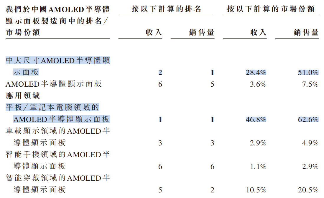 根据第三方数据,以2024年中大尺寸AMOLED半导体显示面板销售量计算,公司位列中国第一,市场份额为51.0%。在平板/笔记本电脑细分领域,以销售量计算,公司同样位列中国第一,市场份额为62.6%。以2024年销售额计算,公司在平板/笔记本电脑AMOLED显示面板领域位列中国第一,市场份额为46.8%。