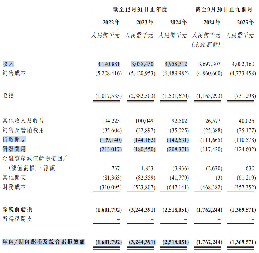 2022年至2024年,公司实现营业收入41.91亿、30.38亿和49.58亿,归母净利润-16.02亿、-32.44亿和-25.18亿,毛利率为-24.3%、-78.4%和-30.9%。2025年1-9月,公司实现营业收入40.02亿元,归母净利润-13.70亿元。A股业绩预告显示,2025年度公司继续出现亏损。