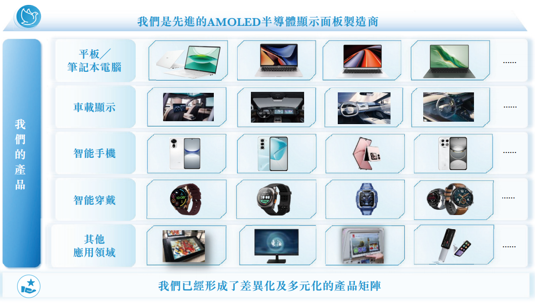 公司主要产品为基于RGB-OLED色彩显示技术的AMOLED半导体显示面板,具备生产刚性、柔性及Hybrid AMOLED显示面板的能力,产品尺寸范围从0.95英寸小型智能穿戴产品到27英寸大型显示面板,具有高刷新率、高亮度、广色域、低功耗、轻薄等优势。