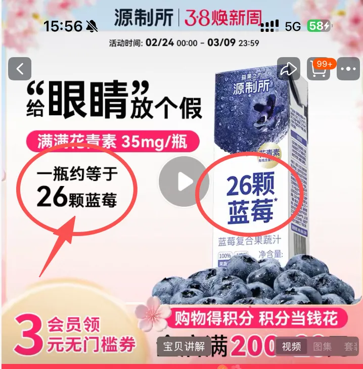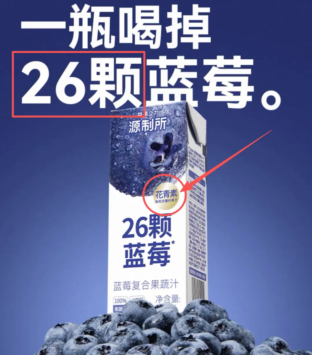 在官方旗舰店的商品详情页,“一瓶喝掉26颗蓝莓”的广告语被置于醒目位置。值得注意的是,这句话从头到尾都未指明“喝掉”的究竟是果实还是花青素,配合大号的视觉效果,极易让消费者先入为主地理解为“瓶中确有26颗蓝莓”。