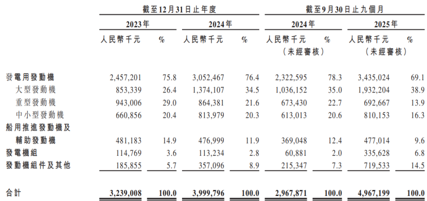 2023年至2025年1-9月(简称“报告期”),玉柴船电来自发电用发动机产品的收入占比有所下降,但仍在70%左右;船用推进发动机及辅助发动机的收入占比有所下降,发动机组件及其他产品收入占比有所提升,发电机组的收入占比较低。