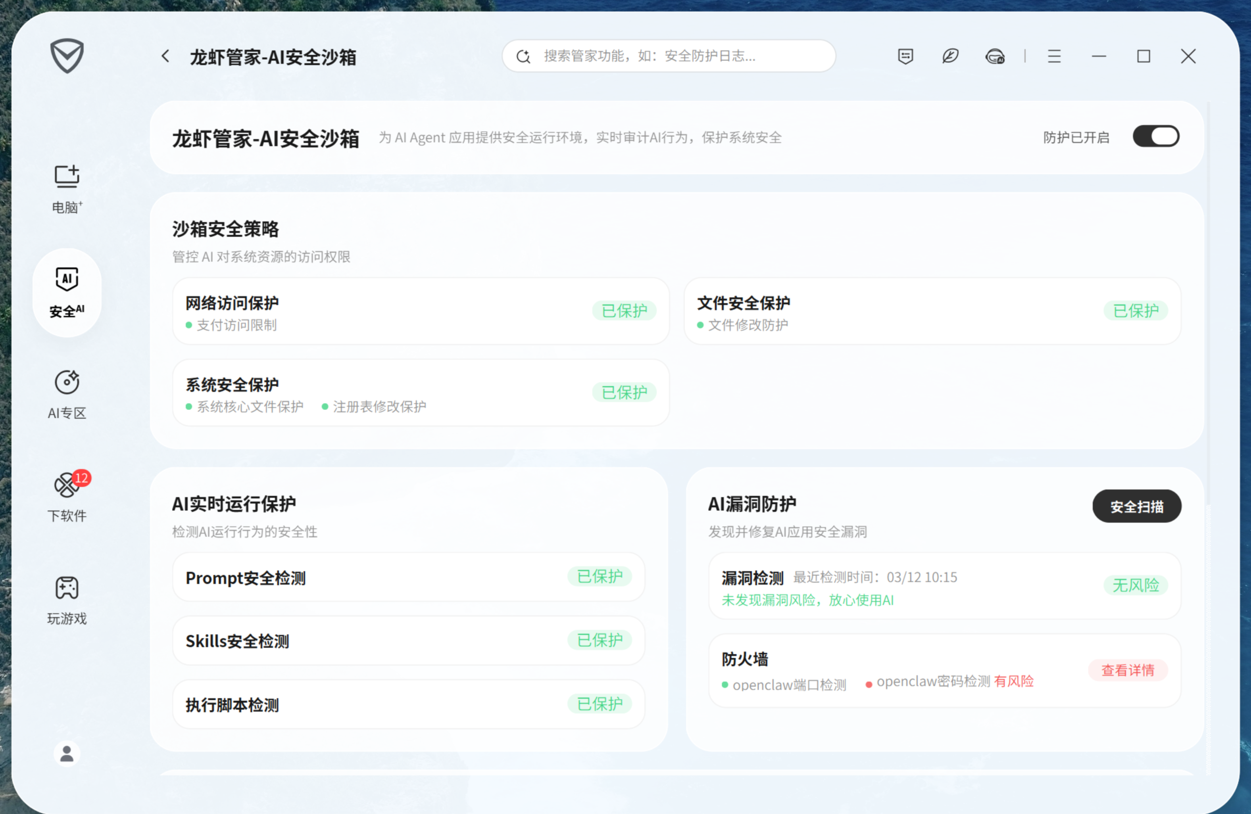 在 AI 运行过程中进行实时安全监测,对 Prompt、Skills、执行脚本 等多个维度进行检测,识别并拦截注入式攻击和高危技能执行,隔离潜在风险操作。