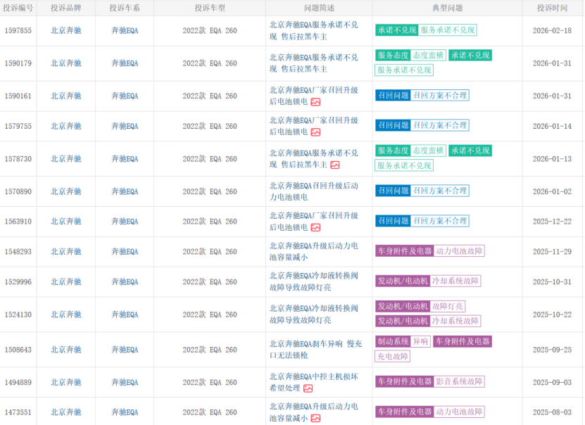 一位北京奔驰EQB车主在车质网投诉“车辆停放自燃,要求尽快处理”,质疑这款车不符合国家标准。同时,这位车主对奔驰的服务也颇有微词,其认为奔驰方面服务态度差,推卸责任,不解决问题,甚至用“逼死车主的节奏”表达无助。