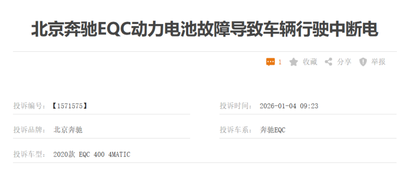 直到现在,车质网上还有诸多关于这款车的投诉。有位车主在车质网投诉:“北京奔驰EQC动力电池故障导致车辆行驶中断电”。
