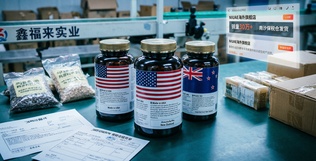 辅酶Q10、护肝片、麦角硫因……多个品牌的“洋保健品”陈列在惠州市鑫福来实业发展有限公司(下称“鑫福来”)办公室,这些产品标签为全英文,印着外国国旗,但实际均出自这家国内工厂。