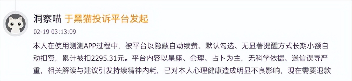 还有消费者反映,在使用测测APP过程中,被平台以隐蔽自动续费、默认勾选、无显著提醒方式长期小额自动扣费,累计被扣2295.31元。
