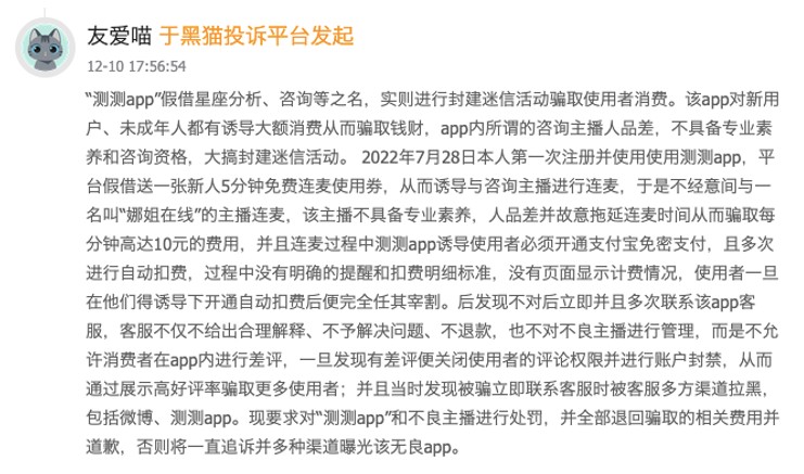 有消费者表示“2022年7月28日本人第一次注册并使用测测APP,平台假借送一张新人5分钟免费连麦使用券,从而诱导与咨询主播进行连麦”,连麦后还遭遇主播不具备专业素养,人品差并故意拖延连麦时间从而骗取每分钟高达10元的费用,并且连麦过程中测测APP诱导使用者必须开通支付宝免密支付,且多次进行自动扣费,过程中没有明确的提醒和扣费明细标准,没有页面显示计费情况。