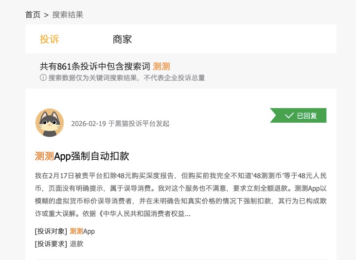 黑猫投诉显示,截至2026年3月3日,与测测相关的投诉达861条。