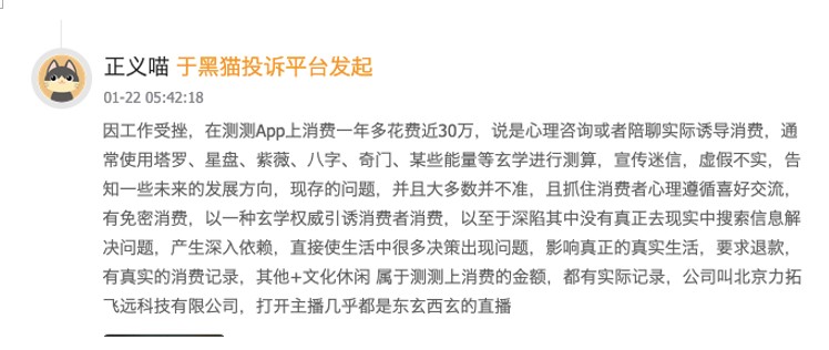 此外,平台对外标榜心理咨询、陪聊,实则提供星盘、紫微、八字等封建迷信测算内容,相关解读存在虚假不实的情况,其以玄学权威的姿态引诱用户消费,还精准抓住用户的情绪弱点,放大用户的困境和焦虑,让用户产生深度依赖,放弃在现实中解决问题的方式,甚至依据平台的不实建议做出错误的生活决策。