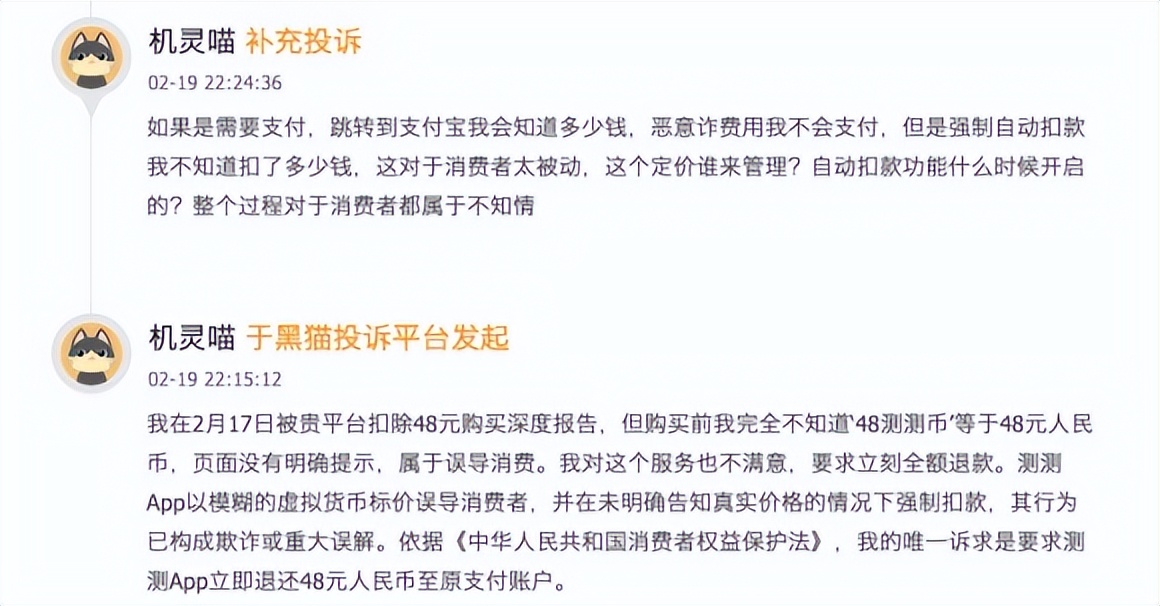 有消费者直言:“我在2月17日被贵平台扣除48元购买深度报告,但购买前我完全不知道‘48测测币’等于48元人民币,页面没有明确提示,属于误导消费”,直指平台的价格模糊问题。