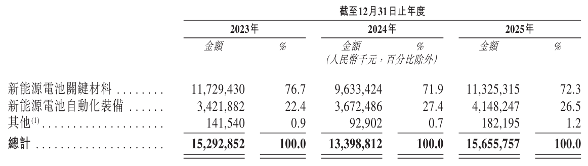 璞泰来2025年来自新能源电池关键材料的收入为113.25亿元,占比为72.3%;来自新能源电池自动化装备收入为41.48亿元,占比为26.5%。