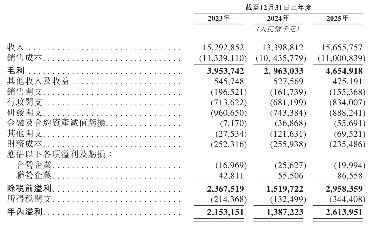 招股书显示,璞泰来2023年、2024年、2025年营收分别为152.93亿、134亿、156.56亿元;毛利分别为39.54亿、29.63亿、46.55亿元;期内利润分别为21.53亿、13.87亿、26.14亿元。