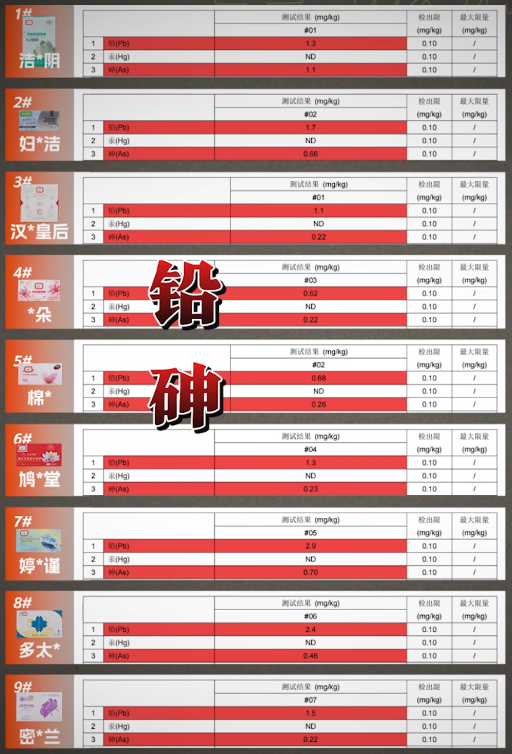 这一关的结果,就不容乐观了:9款产品中,每一款都检出了铅和砷。