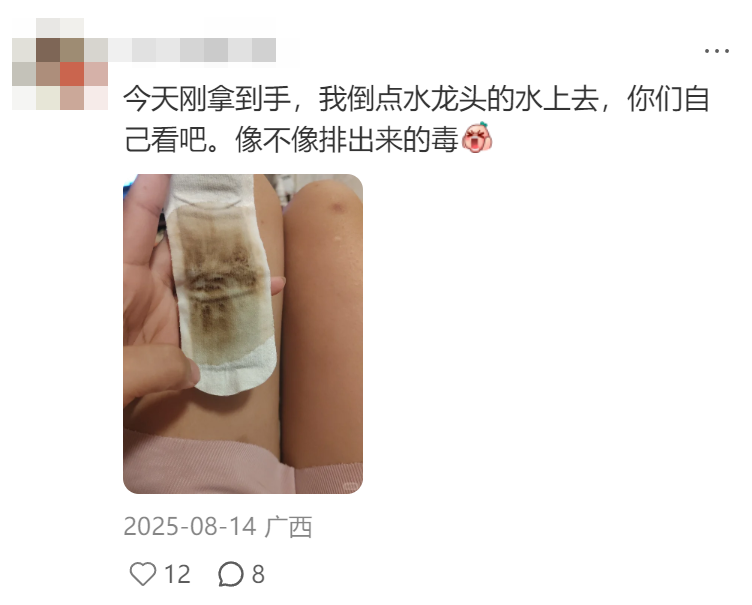 实际上,在雪莲贴上倒点水上去,也能呈现出看起来像排毒的效果。根本不是它们宣传的所谓身体排出来的「垃圾」,而是产品自带的????